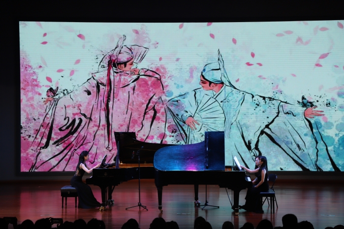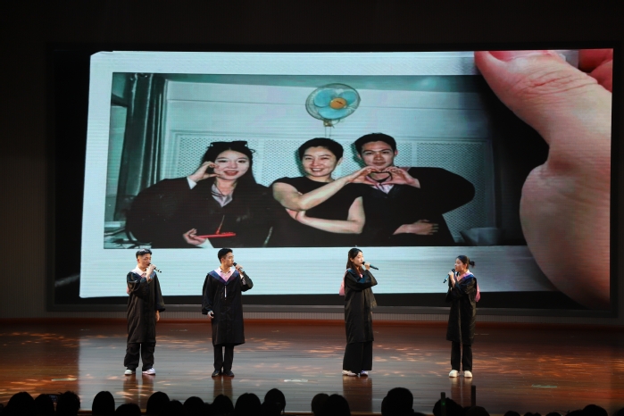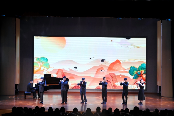 第三篇章:启航新篇。男子独舞《故乡》以细腻动作传递思念与眷恋,表达对母校的深厚感情;双钢琴《梁山伯与祝英台》用经典旋律诉说青春的纯粹与炽热;男女对唱《亲爱的你啊》满含祝福,祈愿毕业生保持热爱,奔赴山海;管乐合奏《光影与梦想的青春乐章》则以恢弘气势,为毕业生奏响启航号角,寄语未来可期。