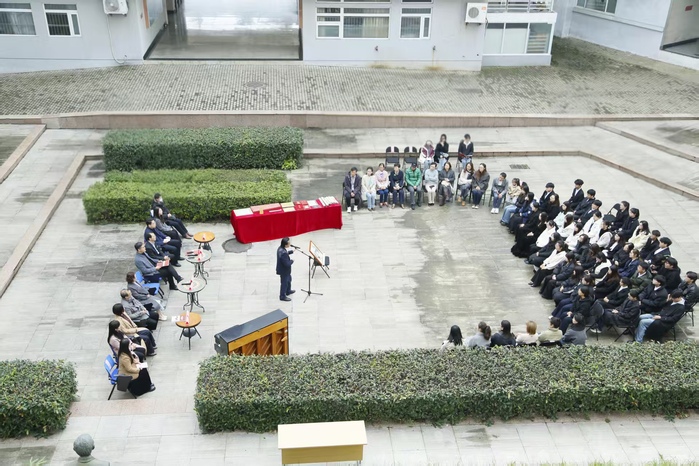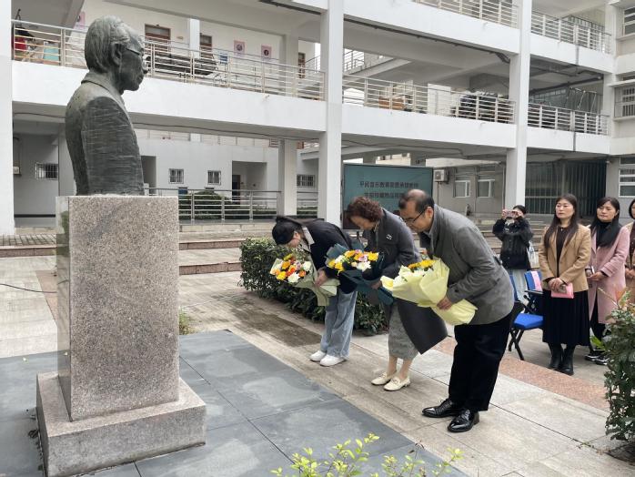 仪式伊始,全体人员肃立,向费承铿教授雕像敬献鲜花并三鞠躬,表达深切追思与崇高敬意。随后,费宏雷先生代表家属致辞,他深情追忆费老一生耕耘教坛、无私奉献的动人往事,以及对音乐学院的师生的深厚感情。