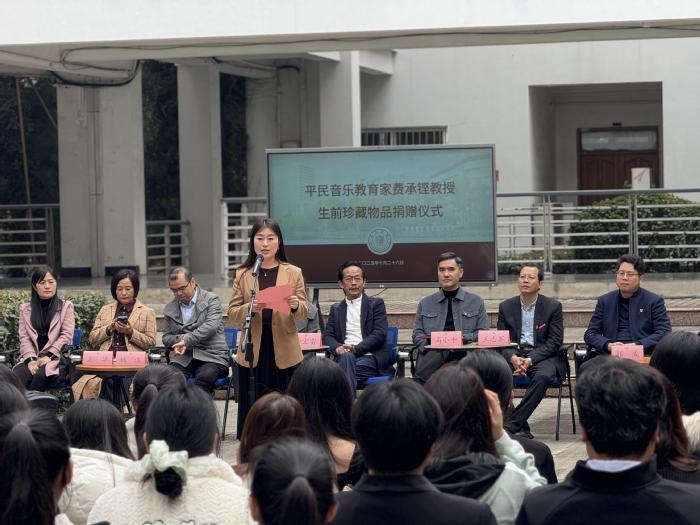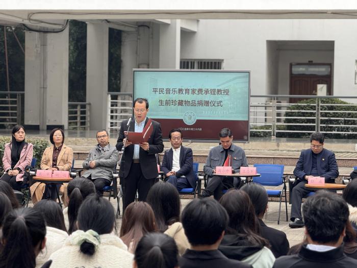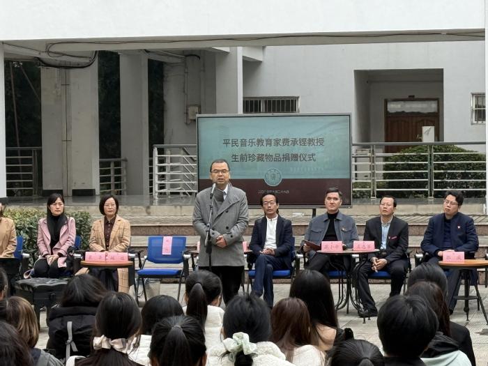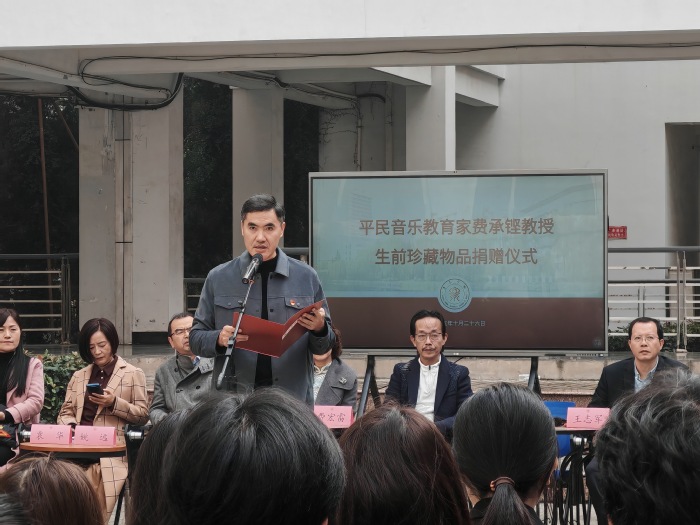 丝竹隽朗谱风华,鉴美求真念师恩。10月26日上午10时,平民音乐教育家费承铿教授生前珍藏物品捐赠仪式在江苏师范大学师德建设基地广场隆重举行。费承铿教授之子费宏雷先生、儿媳朱文静女士,学院班子成员、各界校友及在校师生代表齐聚费老雕像前,共同缅怀费老的馨德懿行。学院党委书记高小平主持仪式。